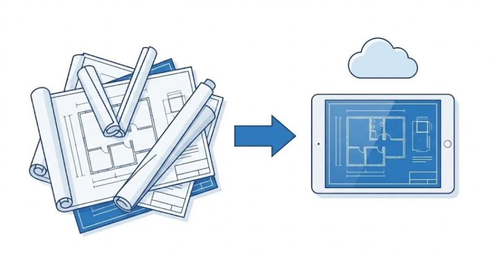 サーバーを社内に置くのではなく、インターネット上の保管庫(クラウド)にデータを保存します。スマホやタブレットからいつでもどこでも図面や写真を確認できるようになります。