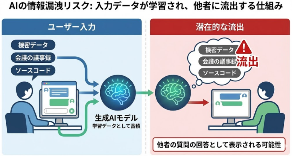 生成AIの最大のリスクは、入力した情報がAIの学習データに取り込まれてしまうことです。