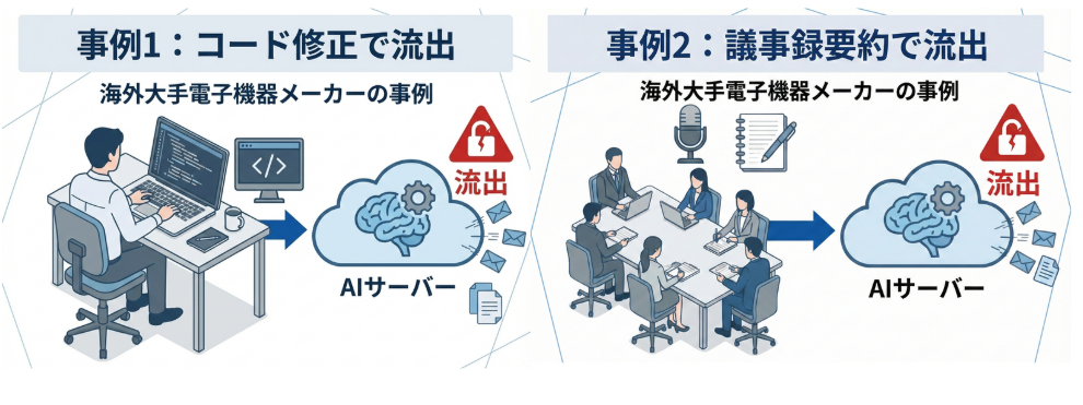 会社が法人プランを契約していても、社員が個人的に別のAIツールを業務に使ってしまうケース。普段使い慣れたツールのほうが楽だから、とやってしまう気持ちはわかりますが、管理外で使えばリスクは丸裸です。