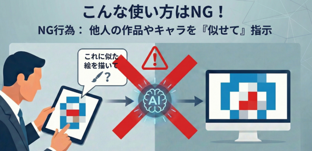 既存の作品に似せた指示を出さず、似た生成物が出てきてもそのまま使わない。