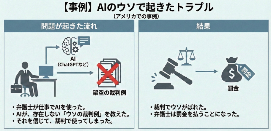たとえば、取引先への提案書をAIに作らせたとき。存在しないデータや事例を根拠に提案してしまえば、会社の信用は一気に失われます。